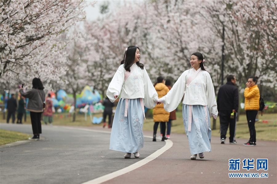 3月18日,游客在眉山樱花博览园里嬉戏。当日,第三届眉山樱花节在位于四川省眉山市的眉山樱花博览园开幕,多个品种的樱花次第盛开,吸引了众多市民和游客前来观赏。近年来,当地政府以举办眉山樱花节等一系列绿色生态旅游节会为突破,持续推动绿色发展,眉山生态旅游已受到省内外游客的广泛青睐。 新华社记者江宏景摄