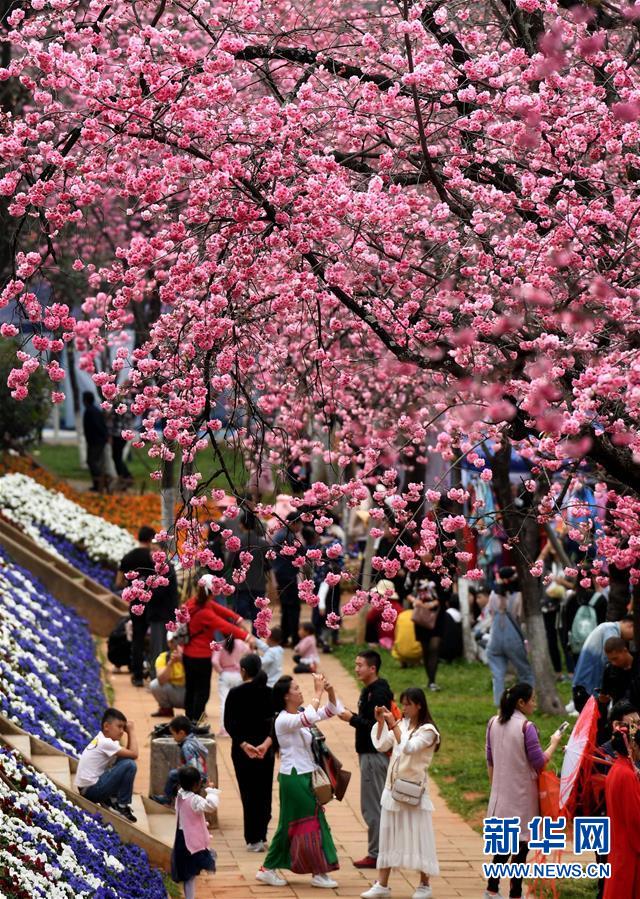 游人在昆明圆通山公园观赏盛开的樱花(3月16日摄)。近日,云南省昆明市迎来樱花盛开的时节。昆明圆通山公园的数千株樱花灿烂绽放,吸引了市民和游客前来观花赏景。新华社记者蔺以光摄