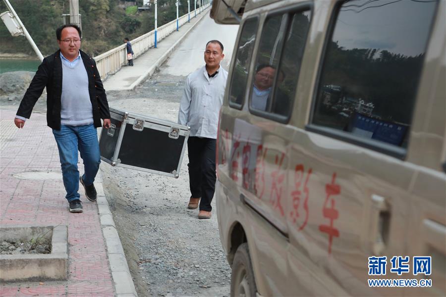 3月19日,在天柱县坌处镇三门塘村,黄宜印(左)与助手王扬清搬运电影播放设备。