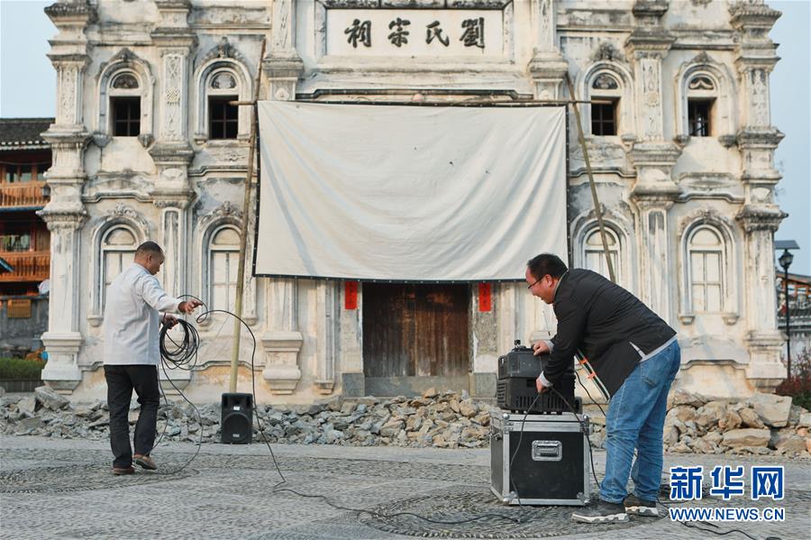 3月19日,在天柱县坌处镇三门塘村,黄宜印(右)在调试电影播放设备。 新华社记者欧东衢摄