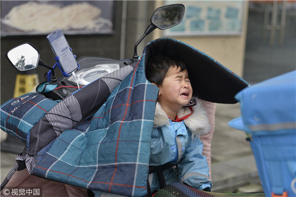 2019年1月8日,浙江嘉兴。独自坐在电瓶车安全座椅中的女儿从睡梦中醒来,哭了起来。