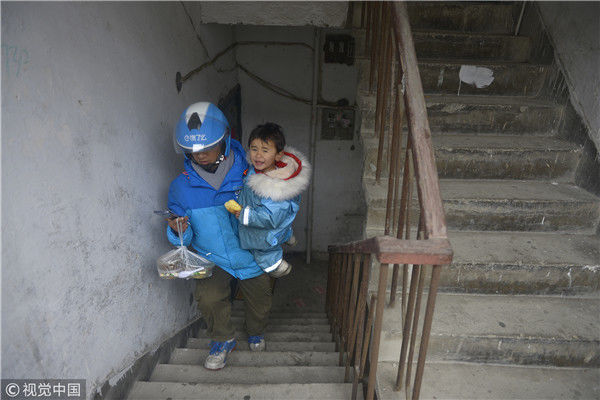 2019年1月8日,浙江嘉兴。即使单手抱着女儿,李帮勇爬楼梯的速度也非常快。