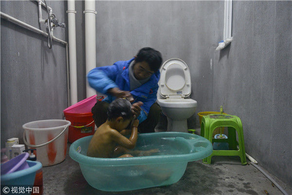 2019年1月15日,浙江嘉兴。洗手间没有任何取暖设备,每天给孩子洗澡是在哭泣声中完成。