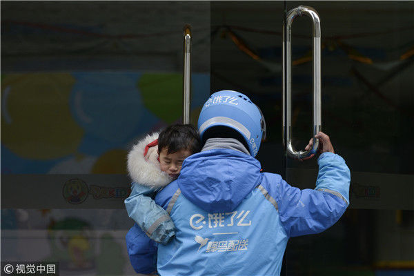 2019年1月8日,浙江嘉兴。李帮勇用不方便的右手拉开门,女儿趴在他肩膀上熟睡。