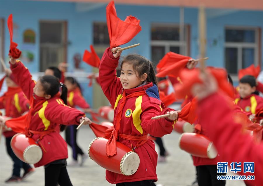 3月20日,百泉小学学生在练习打腰鼓。 近年来,河北邢台经济开发区百泉小学积极开展“阳光大课间”系列活动,将传统腰鼓引入校园,开设校本课程,丰富校园文化生活。 新华社记者 朱旭东 摄