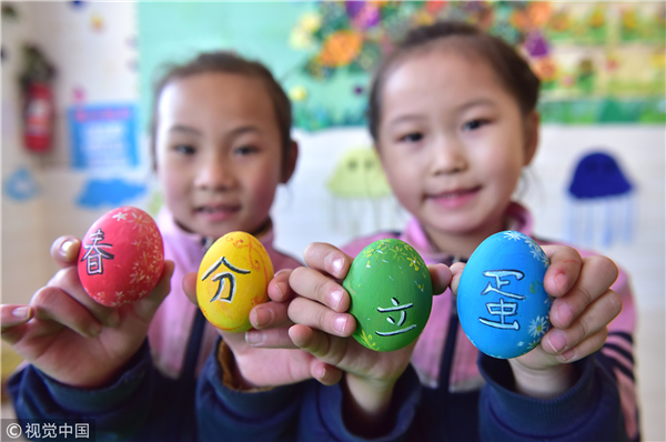 2019年3月21日,石家庄新乐市西长寿幼儿园的两名小朋友在展示写着“春分立蛋”的手绘彩蛋。