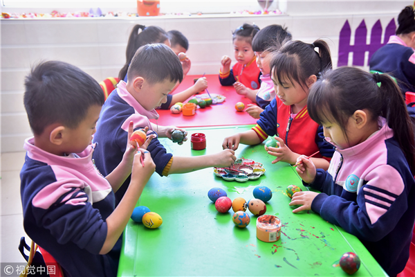 2019年3月21日,河北省张家口市宣化区滨河幼儿园的小朋友在画彩蛋。