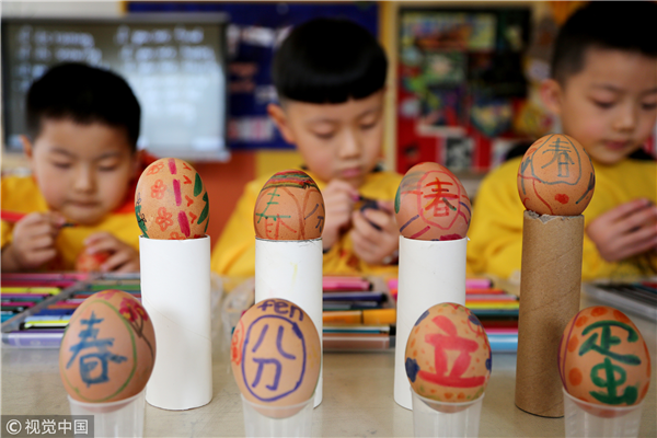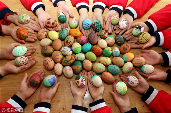 2019年3月21日,江苏连云港市钟声久和幼儿园的小朋友在手绘彩蛋玩“立蛋”游戏。