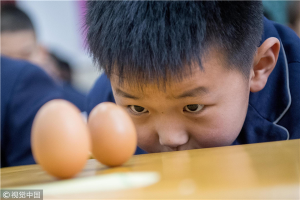 2019年3月21日,春分节气,山西省太原市,小学生在科学课上玩“竖蛋”游戏,感受地球运动的神奇。据老师介绍,春分这一天南北半球昼夜均等,呈66.5度倾斜的地球地轴与地球绕太阳公转的轨道平面刚好处于一种力的相对平衡状态,有利于“竖蛋”。