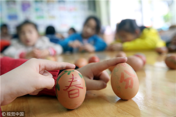 2019年3月21日,江苏省常州市钟楼区科技幼儿园的小朋友在玩竖蛋游戏。吉喆/视觉中国