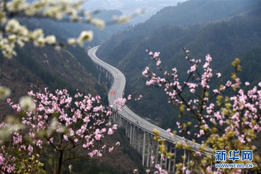贵州思剑高速公路剑河县岑松镇段的春季景观(3月23日摄)。阳春时节,贵州思(南)剑(河)高速公路剑河县岑松镇附近的桃花和梨花陆续开放。 新华社记者杨文斌摄