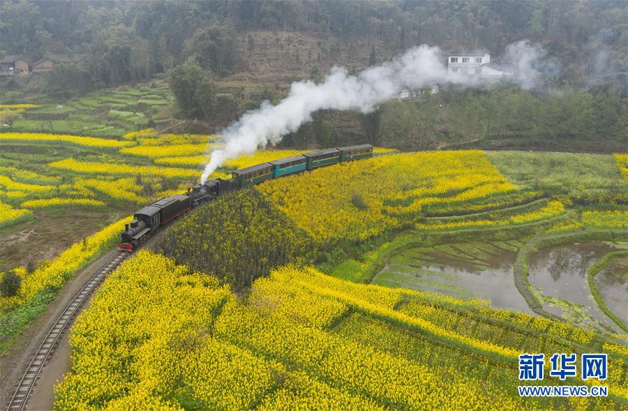 3月20日,一列嘉阳小火车在油菜花丛中穿行(无人机拍摄)。