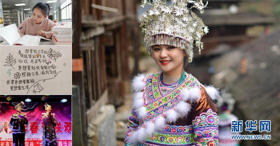 这是一张拼版照片:右图为杨琳诗瑶(2月16日新华社记者黄孝邦摄);左上图为杨琳诗瑶在学校图书馆里学习(3月23日摄,杨琳诗瑶供图);左中图为杨琳诗瑶在纸上写下的梦想(3月23日摄,杨琳诗瑶供图);左下图为杨琳诗瑶(右)在家乡主持苗寨的春节联欢晚会(2月10日新华社记者黄孝邦摄)。杨琳诗瑶是融水苗族自治县杆洞乡杆洞村的苗族姑娘,去年以优异成绩考上广西民族大学。 新华社发