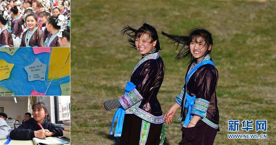 这是一张拼版照片:右图为韦迎春(右)和同学在一起(2月6日摄);左上图为韦迎春(中)在家乡的“打同年”活动中(2月7日摄);左中图为韦迎春在小卡纸上写下的梦想(3月22日摄);左下图为韦迎春在课堂上听课(3月22日摄)。韦迎春来自融水苗族自治县杆洞乡尧告村,目前在融水民族高中读高一。 新华社记者 黄孝邦 摄