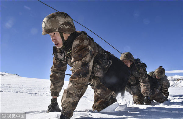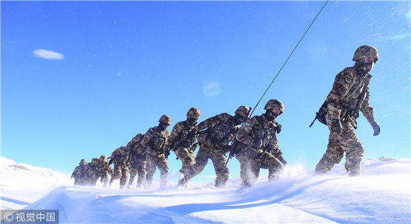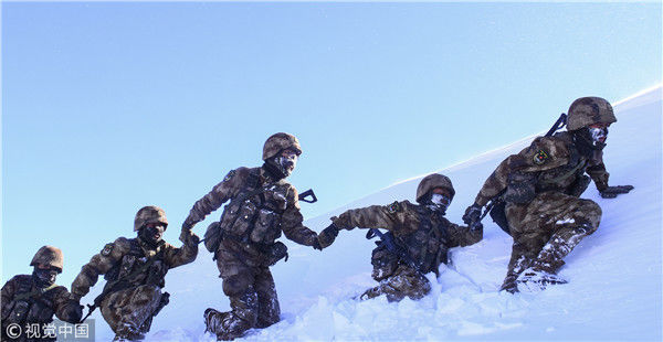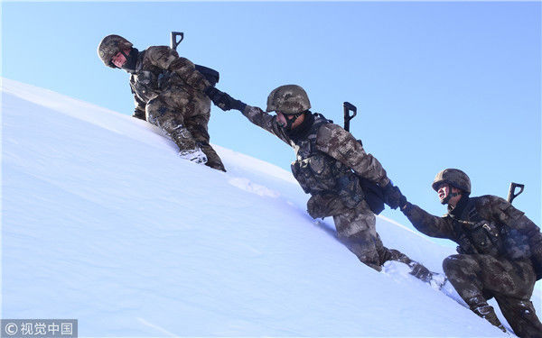2019年3月26日,西藏阿里,由于积雪较厚,巡逻官兵采用手脚并用的方法向点位前行。刘晓东/视觉中国