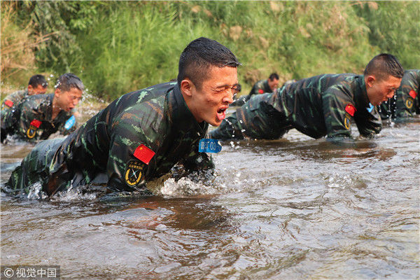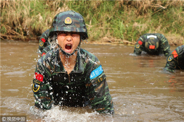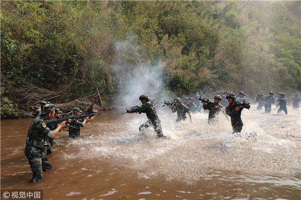 2019年3月24日,云南西双版纳,特战队员峡谷涉水追击。