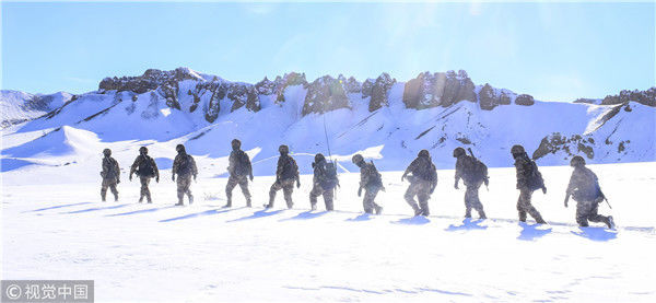 2019年3月26日,西藏阿里,巡逻分队正在踏雪向点位前行。