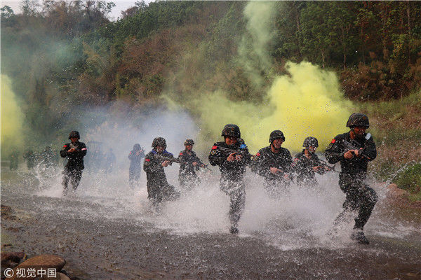 2019年3月24日,云南西双版纳,特战队员穿越封锁区。