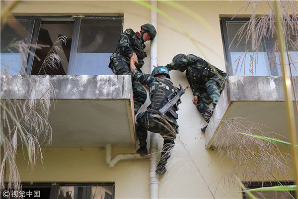 2019年3月25日。云南西双版纳,突击小组协作突入楼房。