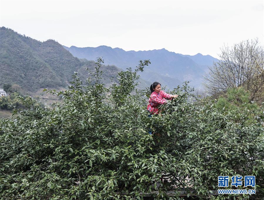 3月26日,村民在采摘鸠坑“茶树王”顶端的茶叶。新华社记者徐昱摄