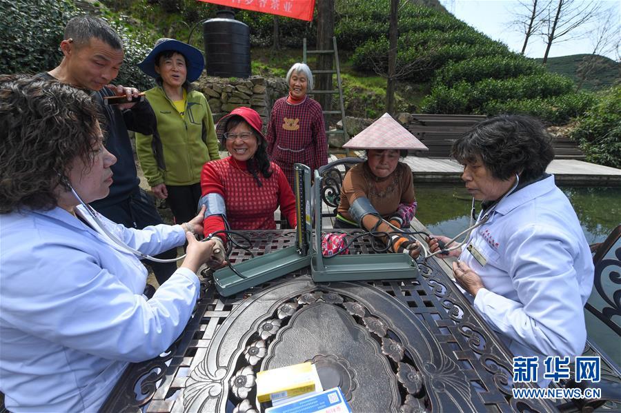 3月26日,和平镇的医疗工作人员在滩龙桥村茶山脚下为采茶工提供义诊服务。随着春季采茶高峰的来临,浙江省长兴县和平镇当地政府联合卫生院、邮政支局、派出所、消防队等多部门开展采茶季基层党员志愿者“三服务”活动(服务企业、服务群众、服务基层),包括上山义诊、上门快递、安全生产检查、夜间安全巡查、签订正规劳务合同等多项内容,全力保障采茶工作顺利进行,助力茶农增产增收。新华社记者徐昱摄