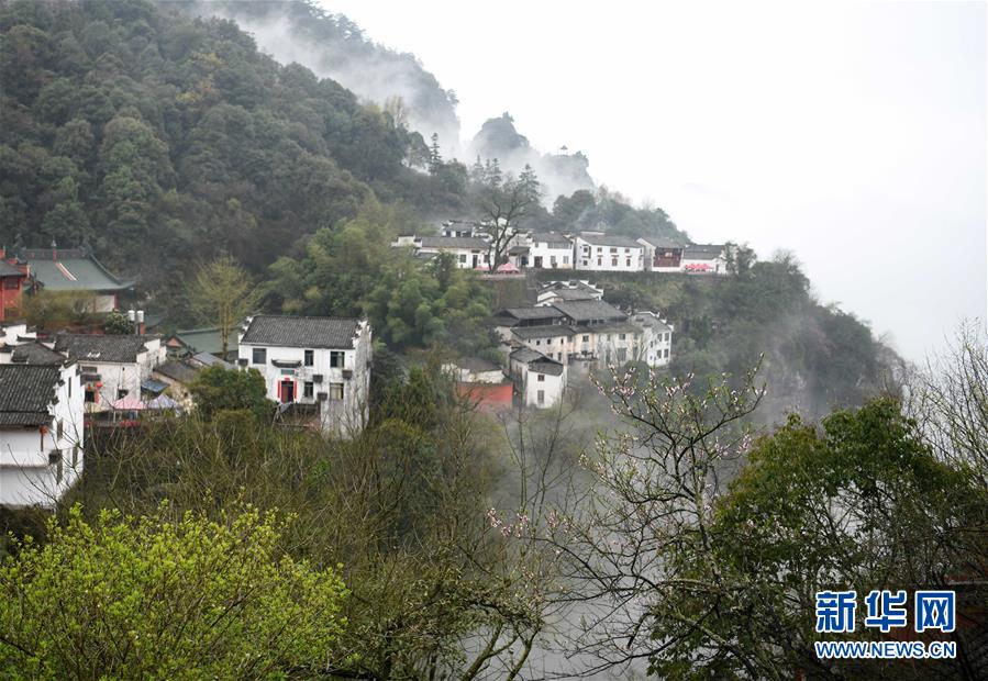 这是3月27日拍摄的安徽省黄山市齐云山风景区。 当日,安徽省黄山市齐云山风景区云雾缭绕,风景秀美。 新华社记者 刘军喜 摄