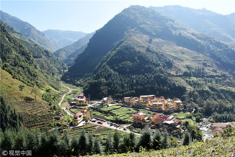 2018年12月22日,云南红河,人字桥不远处有一个村庄,掩映在绿树农田中,远远望去别有一番风情。