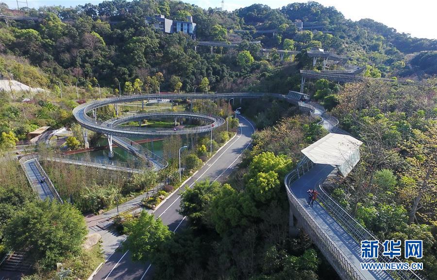 这是福州依山势而建的全钢结构悬空城市森林步道“福道”(3月25日无人机拍摄)。 福州又名“榕城”,以山水相宜闻名。近年来,福州充分发挥依山傍水优势,加快建设融会贯通、纵横交错的城市绿道网络,城市生态环境焕然一新,有力提升了城市的宜居品质。 新华社记者林善传摄