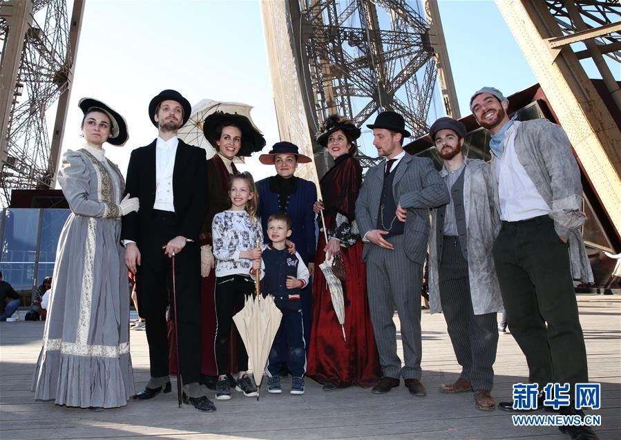 3月30日,在法国巴黎,音乐剧《300米高塔》的演员身着19世纪服装在埃菲尔铁塔一层平台与游客合影。于1889年3月31日正式落成的法国巴黎埃菲尔铁塔迎来130岁生日。从30日起,包括演出、冒险游戏、图片展在内的多项活动在埃菲尔铁塔举行,为这座宏伟建筑庆生。新华社记者 高静 摄