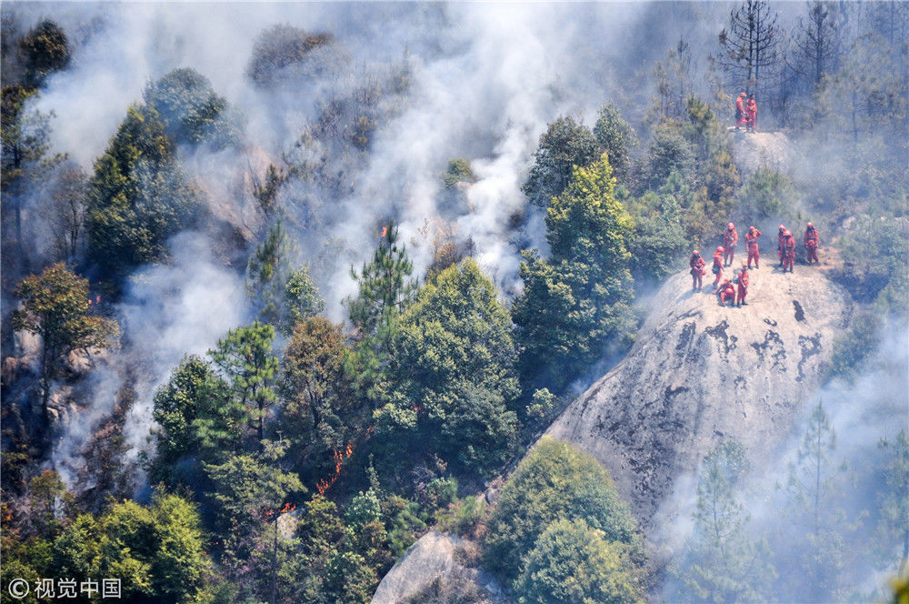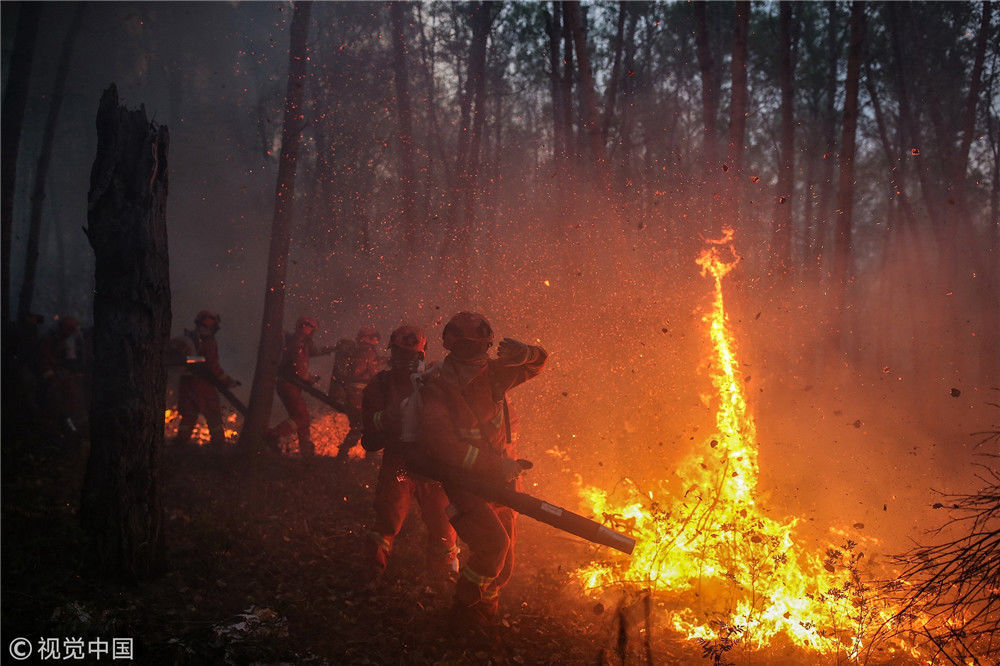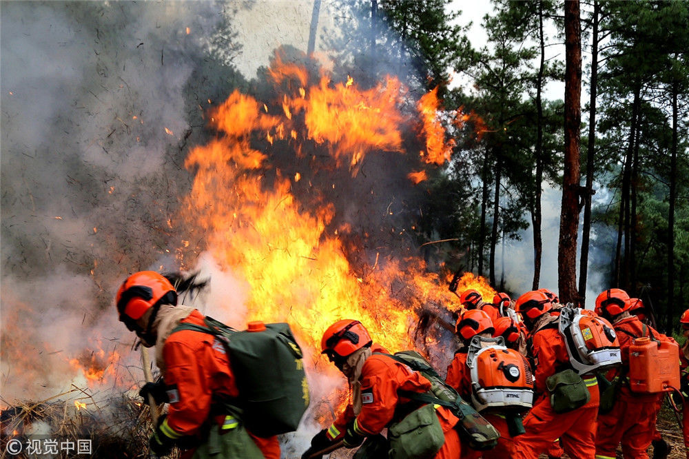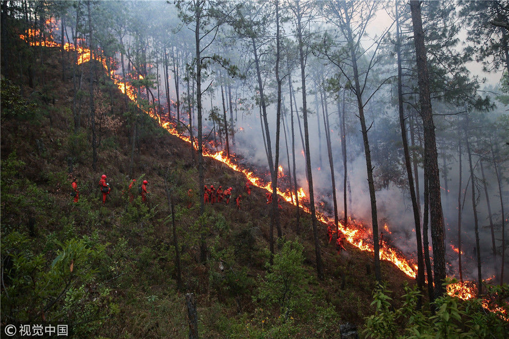 2017年3月19日,四川凉山木里,森林中扑灭大火的消防员。