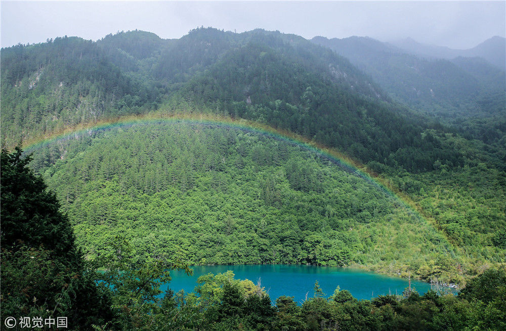 2017年8月12日,四川阿坝九寨沟,彩虹出现在湖泊上空。