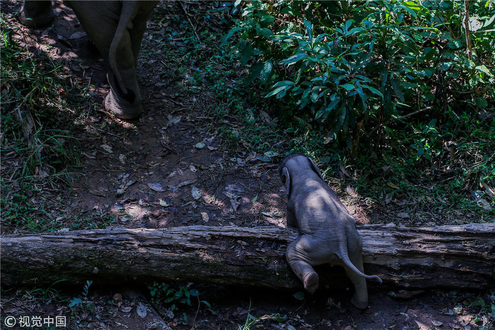 2017年2月17日,云南西双版纳,一头小象跨过倒在地上的树木。