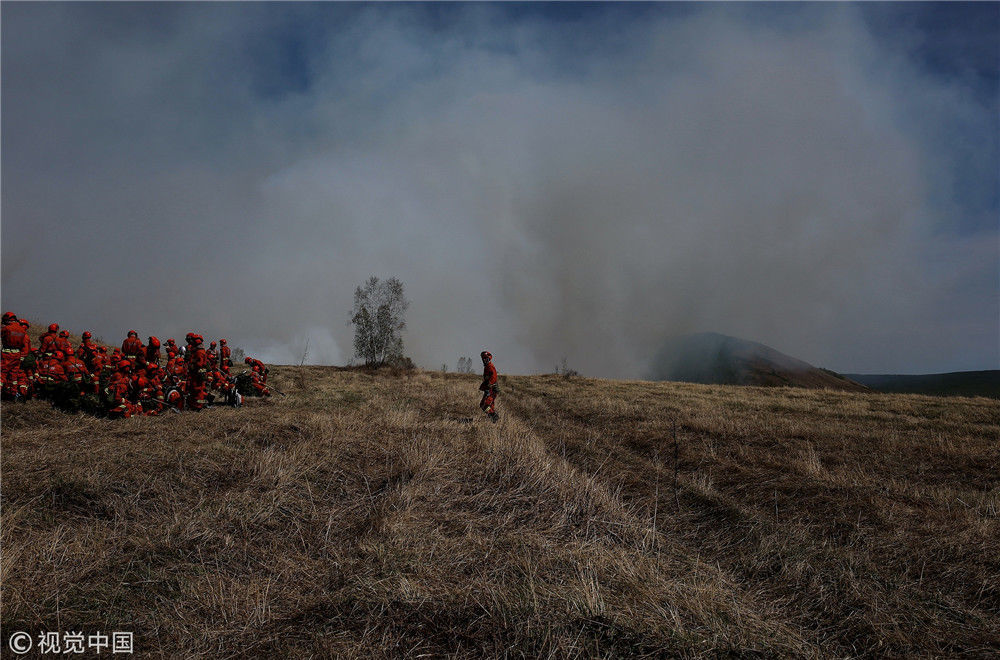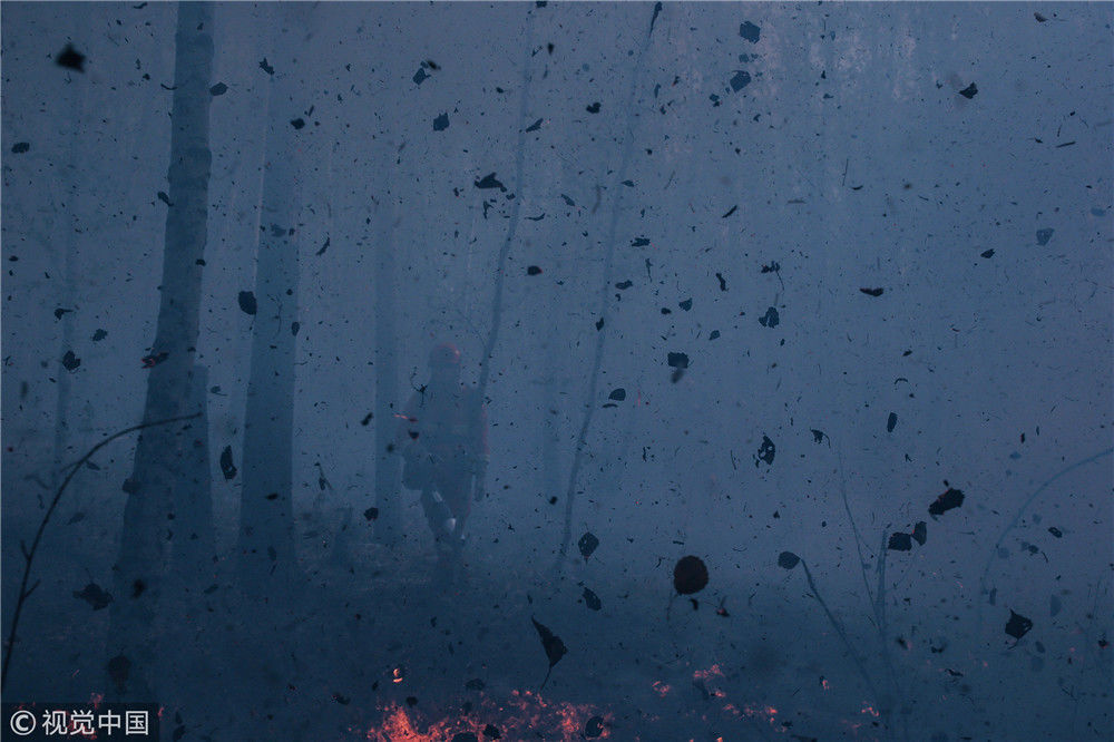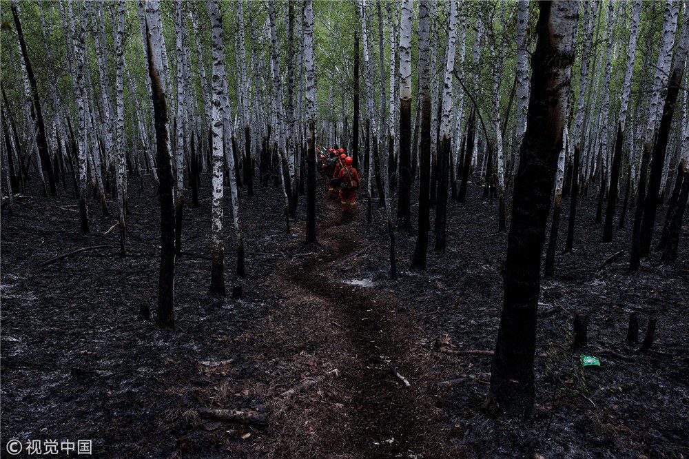2017年5月20日,内蒙古大兴安岭,扑火后的消防员行走在劫后余生的森林中。