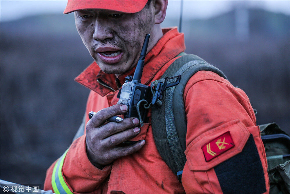 2017年5月4日,内蒙古呼伦贝尔,武警森林部队一名班长在报告他们班所负责的火线扑救情况。