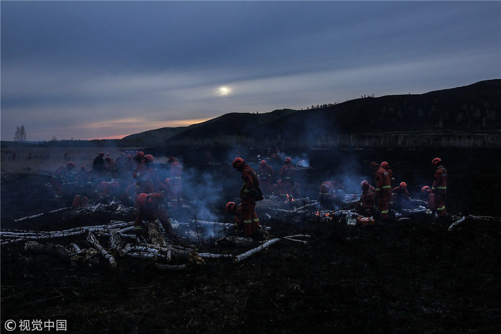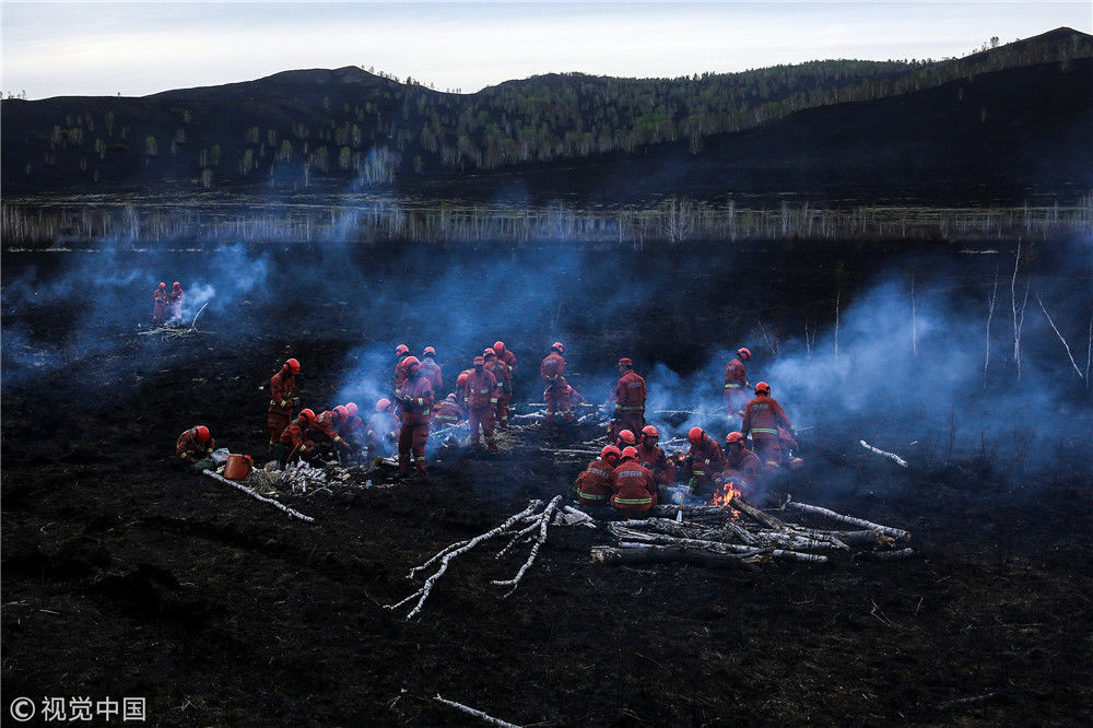 2017年5月20日,内蒙古大兴安岭,扑火后的消防员在火烧迹地内休息。