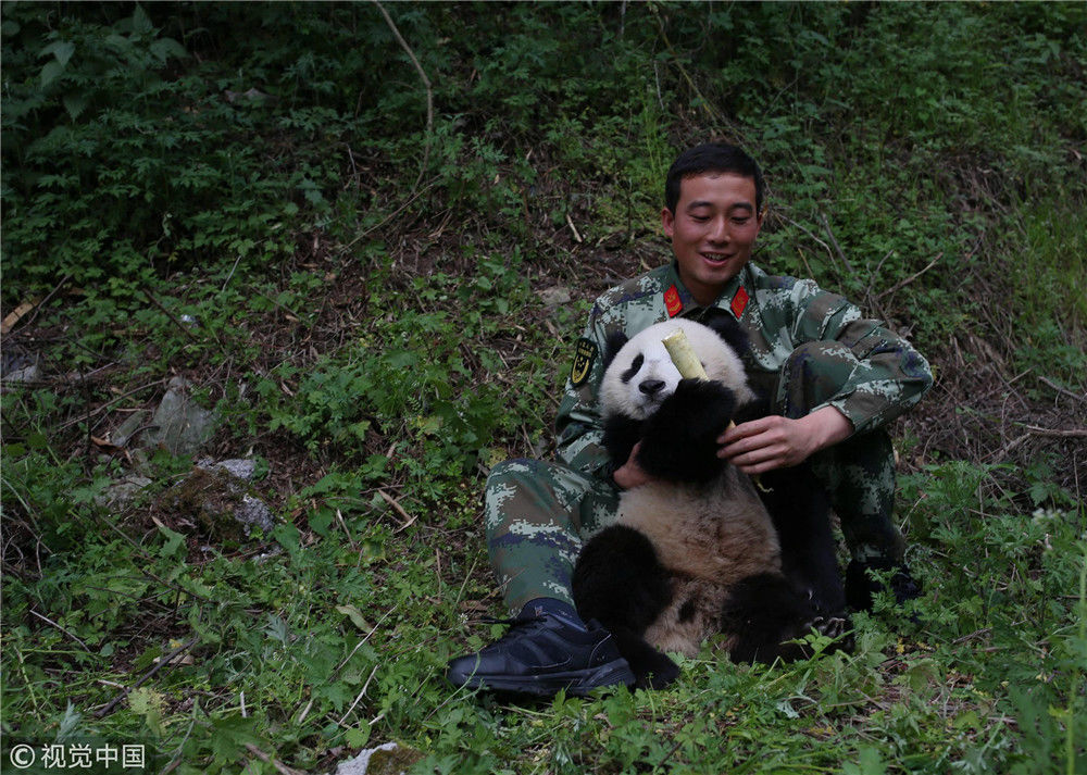 2016年5月5日,战友在四川省卧龙自然保护区与熊猫合影留念。“一定要把手洗干净、消好毒,要温柔、要体贴……”每年老兵退伍,中队会组织官兵向大熊猫告别!王刚送走了一批又一批战友,一只又一只熊猫,与熊猫合影后,他就要离开这个坚守了12年的第二故乡了。
