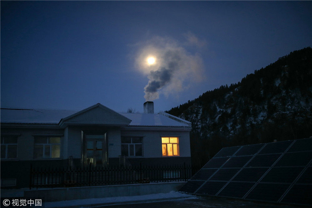2016年12月16日,内蒙古呼伦贝尔奇乾,夜空下消防员的驻地冒出缕缕炊烟。
