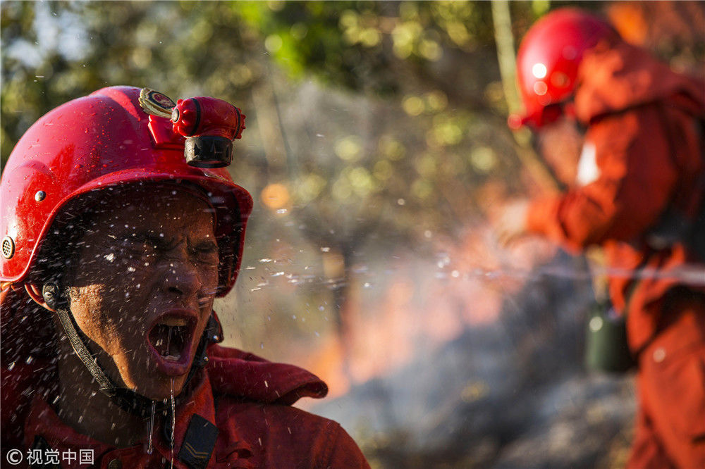 2015年3月8日,在四川省西昌市火场,一直在扑打火头的杨小辉,突然转身要求战友用水枪在他脸上喷水,他发出长长的怒吼后,继续向前扑打!