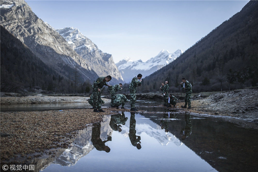 2016年5月3日,四川阿坝,森林消防员在洗漱,背后是巍峨雪山。
