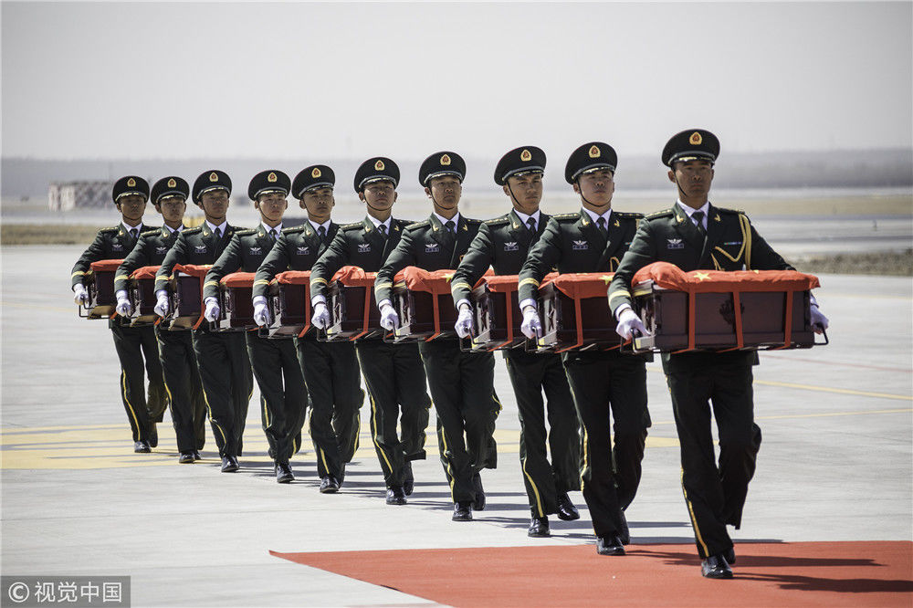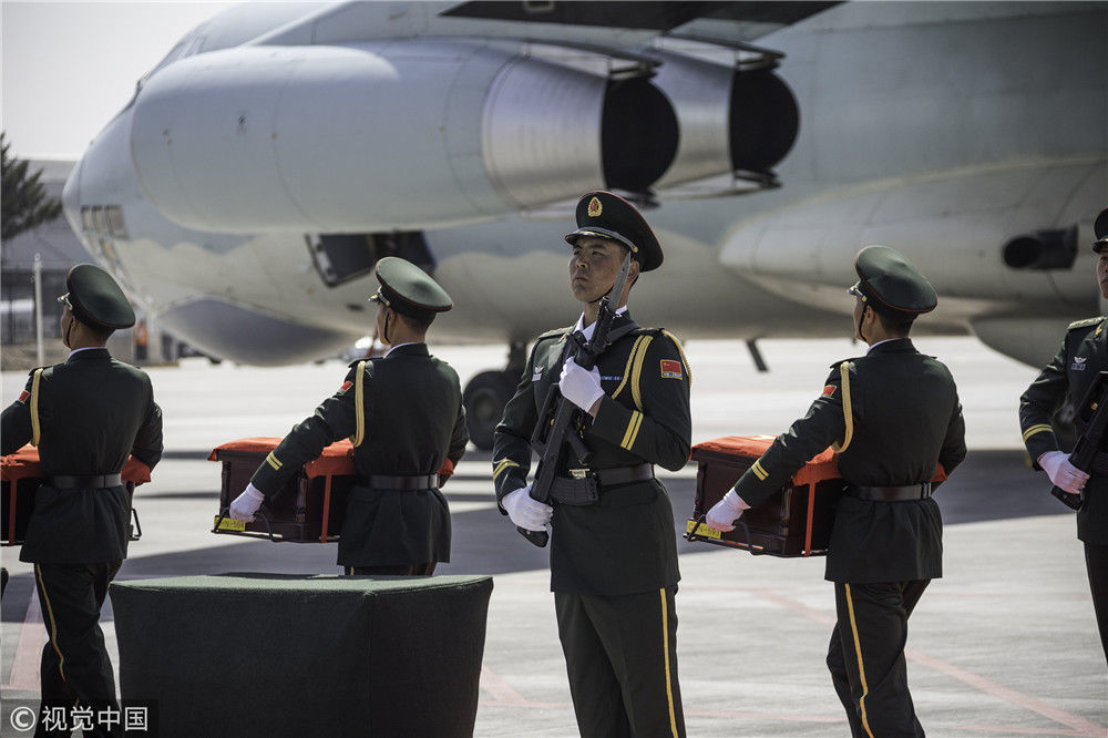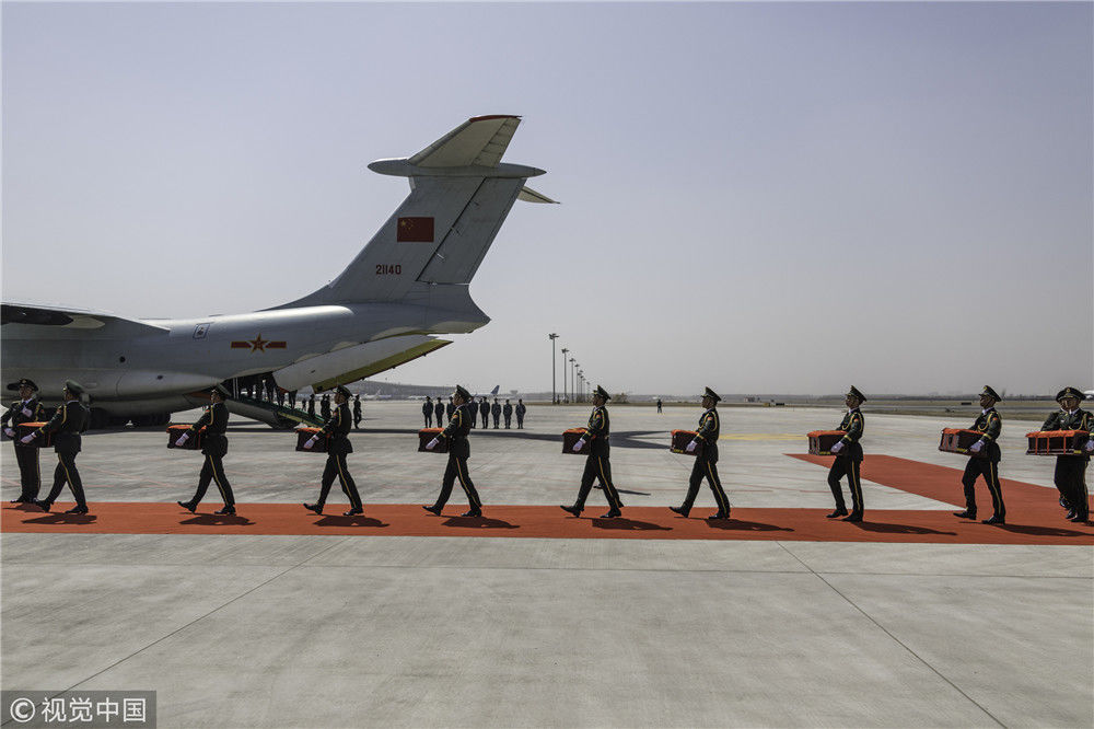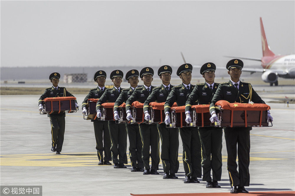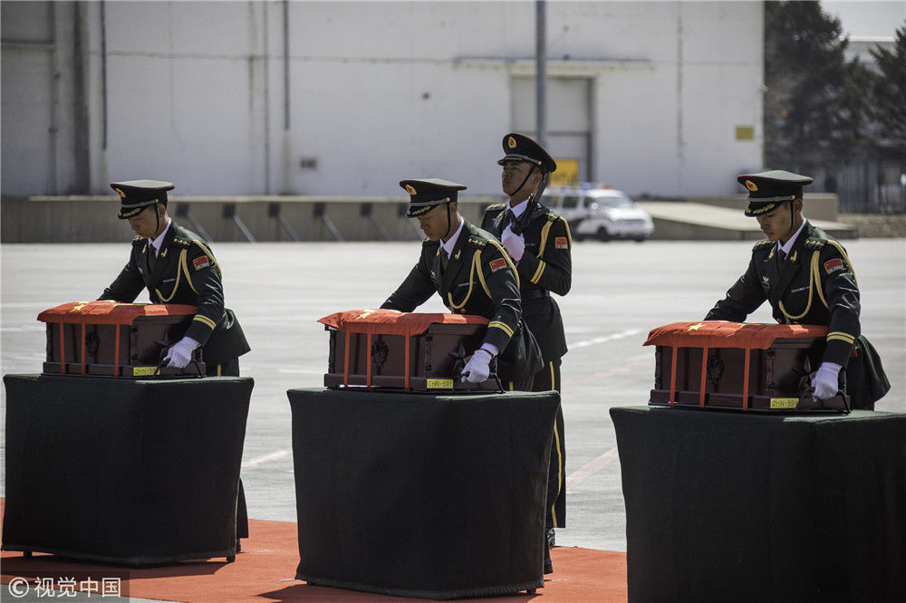 2019年4月3日消息,沈阳。根据中韩双方就在韩志愿军烈士遗骸交接达成共识,第六批在韩志愿军烈士遗骸于今天(4月3日)回归祖国,并将在沈阳桃仙国际机场举行迎接仪式。从2014年至2018年,已有五批共589位在韩志愿军烈士遗骸被祖国接回。60多年前,他们保家卫国,英勇就义;如今,祖国用最高的礼仪迎接英雄归来。山河已无恙,最可爱的人,欢迎回家!陈松/视觉中国
