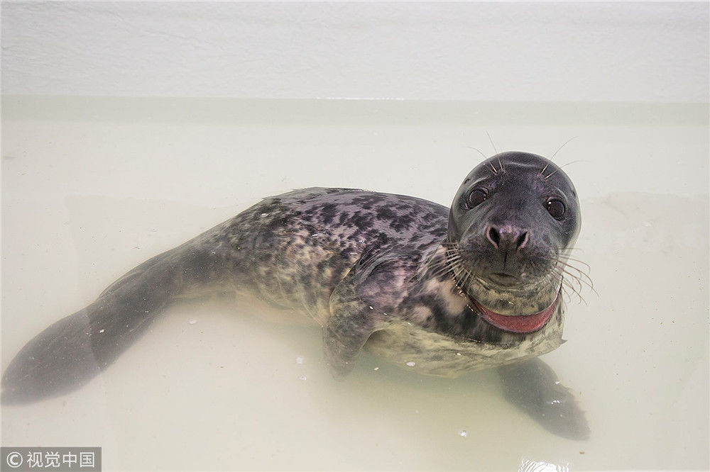 当地时间2018年3月20日,英国亨斯坦顿海洋生物中心,一只名为Relashio的海豹被塑料环卡住险些窒息而亡,它现在只能仰泳减少痛苦。SWNS/视觉中国