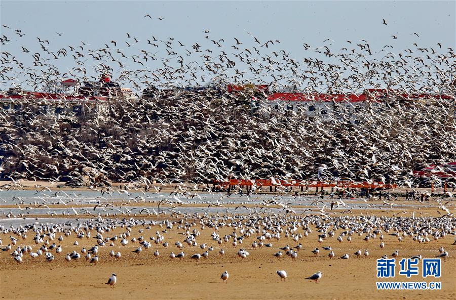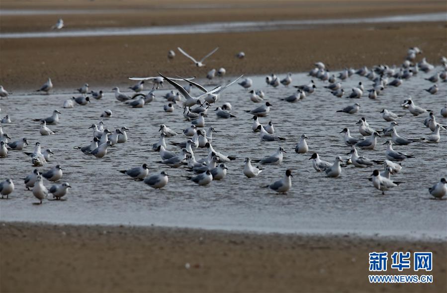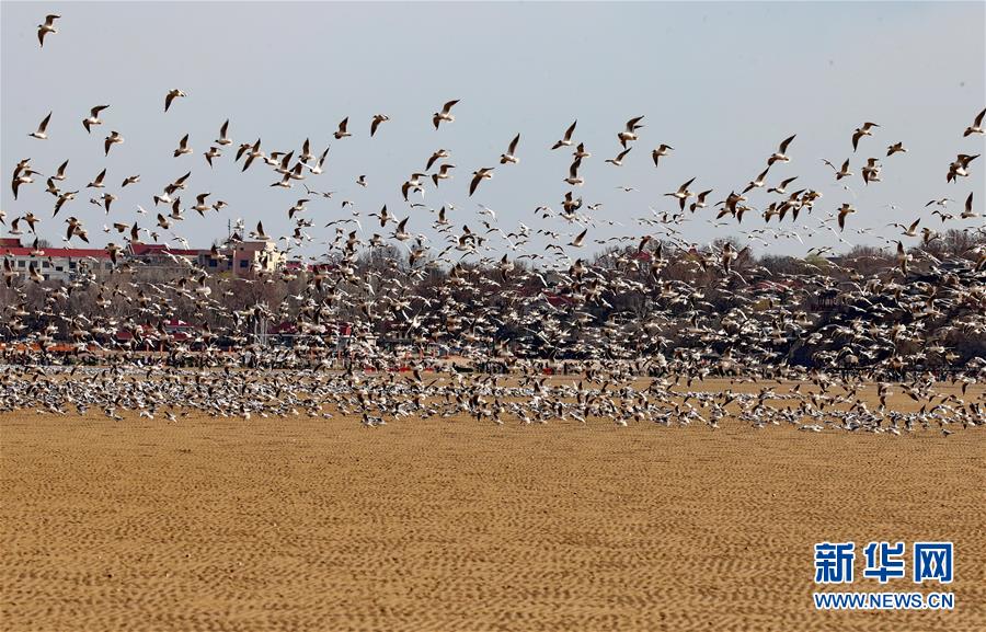 4月4日,一群候鸟在秦皇岛市沿海湿地飞翔、休憩。近日,大批候鸟飞抵河北省秦皇岛市沿海湿地,出现“万鸟临海”奇观。秦皇岛沿海湿地鸟类食物丰富,每年春、秋两季,大批候鸟迁徙经过这里。新华社记者 杨世尧 摄