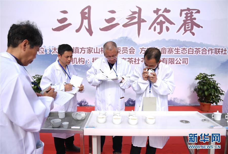 4月6日,茶叶评审专家在现场通过闻香、品茶对参赛茶叶进行评选。 当日,“2019年首届白茶故里·方家山三月三斗茶赛”在福建省福鼎市太姥山镇方家山村举行。茶农们带来了今年的新茶参加斗茶、评茶活动,吸引了众多的游客和茶人共同品鉴。 福建省福鼎市太姥山镇方家山村是福鼎市重要的白茶产区之一,素有“白茶故里”之称。 新华社记者 林善传 摄