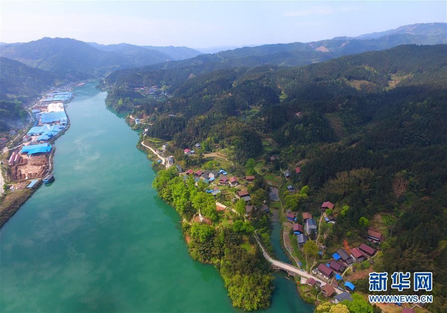 4月6日无人机拍摄的贵州省锦屏县三江镇清水江沿岸春色。 清明时节,地处贵州省黔东南苗族侗族自治州的锦屏县处处春意盎然,景色如画。 新华社记者杨文斌摄