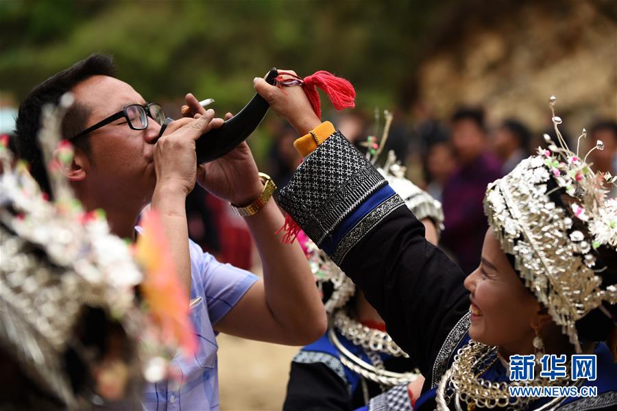 苗族群众给来宾敬牛角酒(4月6日摄)。4月6日至7日,在贵州省黔东南苗族侗族自治州剑河县观么镇新民村和新合村,来自剑河县和三穗县的苗族同胞欢聚一堂,通过民族歌舞展演、非遗手工艺展示、千户祭“巫耶”、跳芦笙舞等形式,与来宾一起欢庆2019年高雍苗族“三月三”民俗文化节。 新华社记者 杨文斌 摄