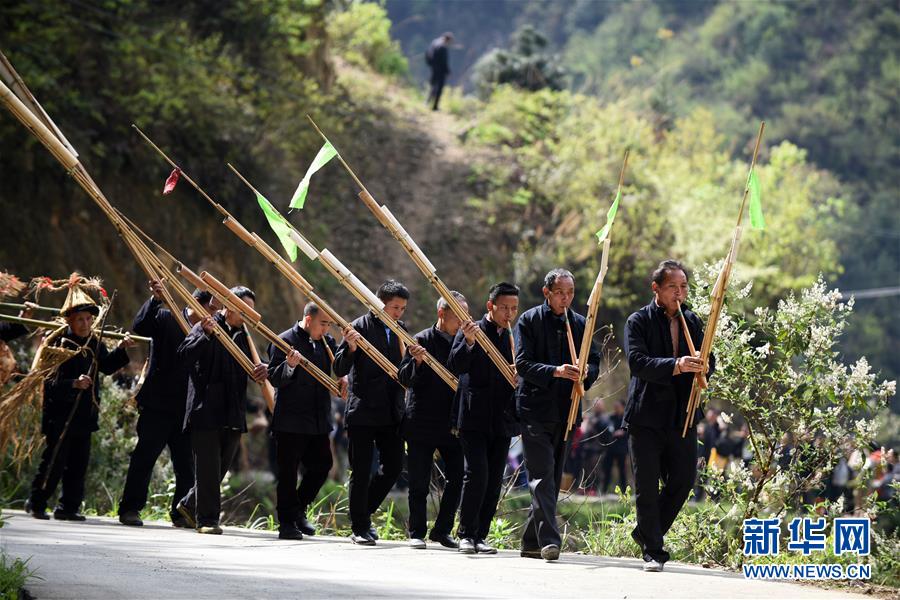 4月7日,苗族群众吹着芦笙走在参加“三月三”民俗活动途中。4月6日至7日,在贵州省黔东南苗族侗族自治州剑河县观么镇新民村和新合村,来自剑河县和三穗县的苗族同胞欢聚一堂,通过民族歌舞展演、非遗手工艺展示、千户祭“巫耶”、跳芦笙舞等形式,与来宾一起欢庆2019年高雍苗族“三月三”民俗文化节。 新华社记者 杨文斌 摄