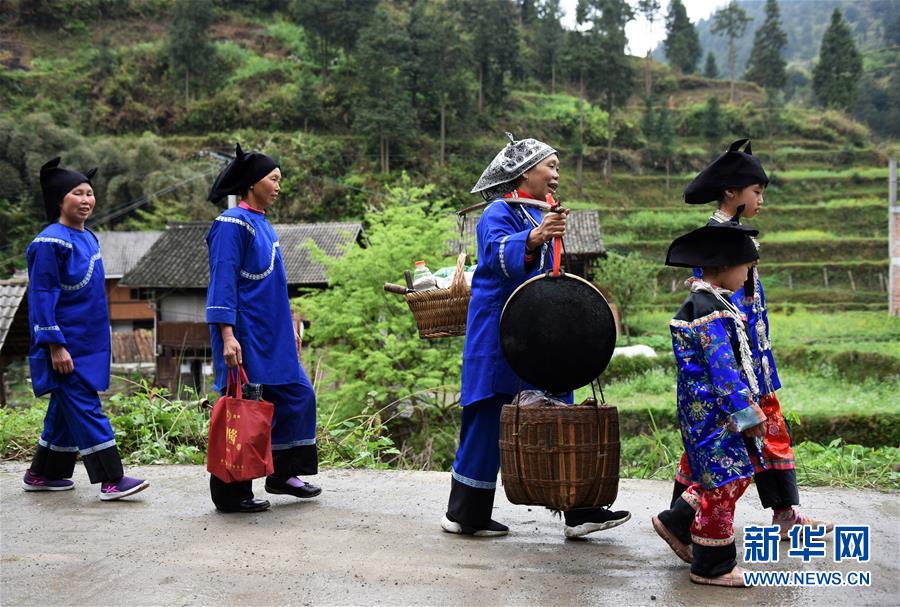 4月7日,苗族群众挑着祭品走在祭“巫耶”仪式途中。4月6日至7日,在贵州省黔东南苗族侗族自治州剑河县观么镇新民村和新合村,来自剑河县和三穗县的苗族同胞欢聚一堂,通过民族歌舞展演、非遗手工艺展示、千户祭“巫耶”、跳芦笙舞等形式,与来宾一起欢庆2019年高雍苗族“三月三”民俗文化节。 新华社记者 杨文斌 摄
