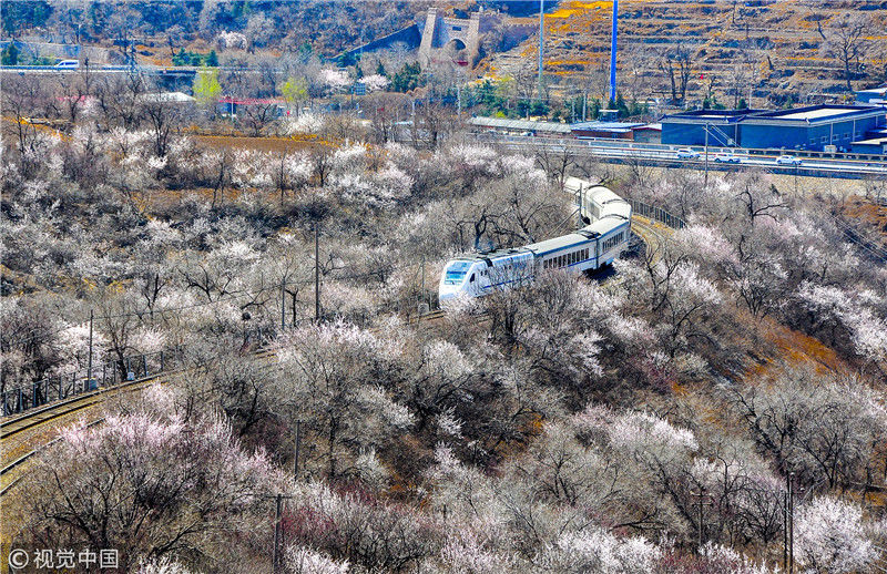 2019年3月22日,北京居庸关附近的山花盛开,S2线列车穿行在花海之中,构成一幅美丽的画面。时永平/千龙图像/视觉中国 编辑/陈进