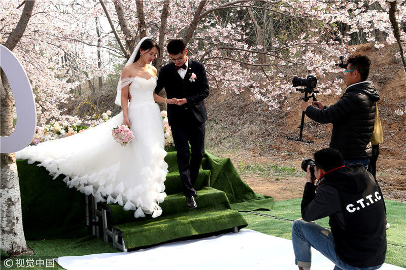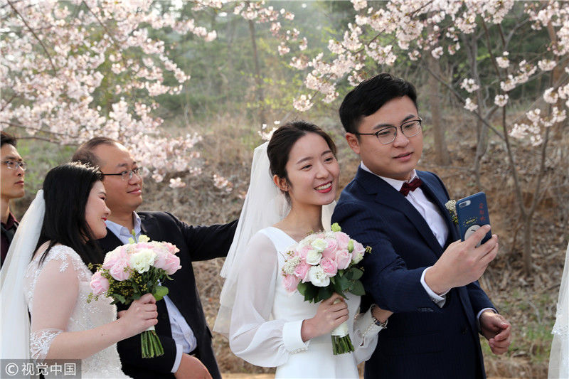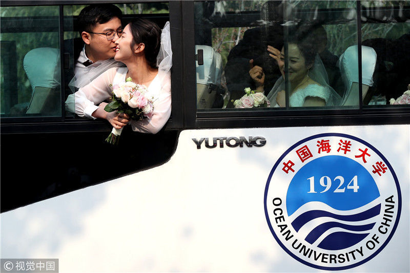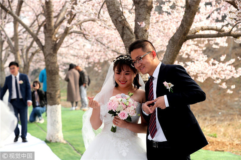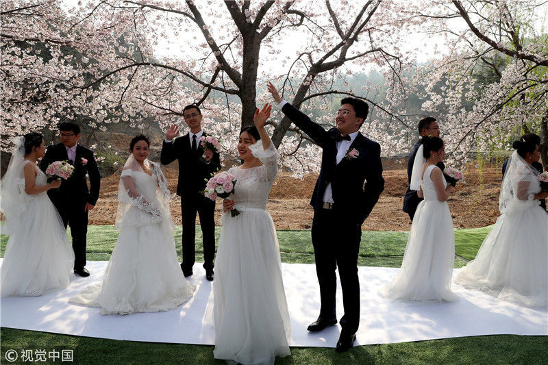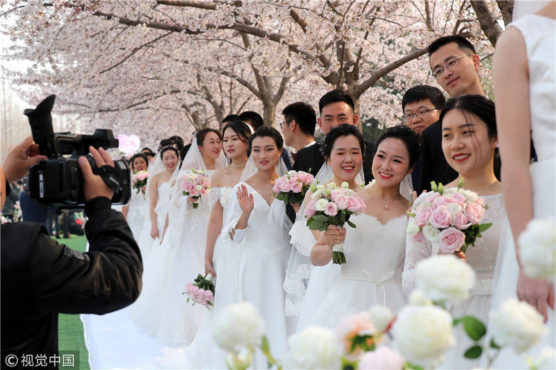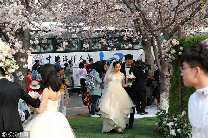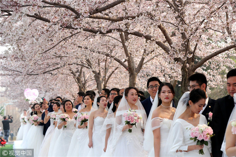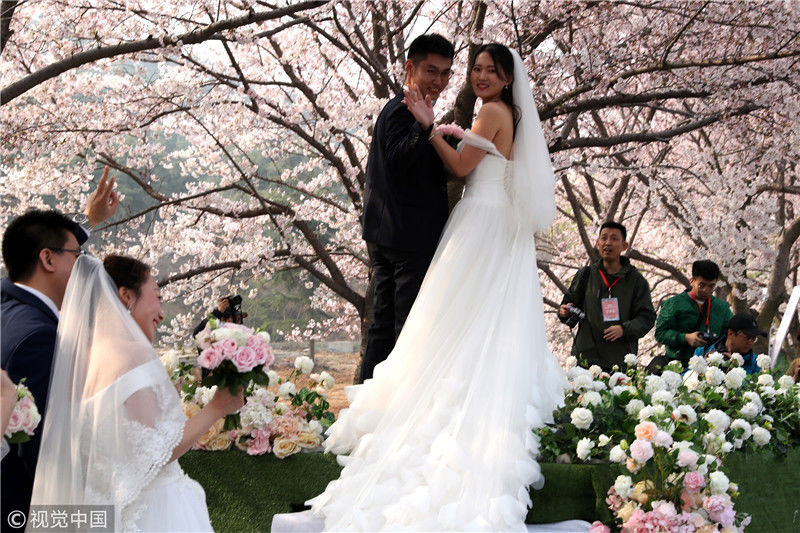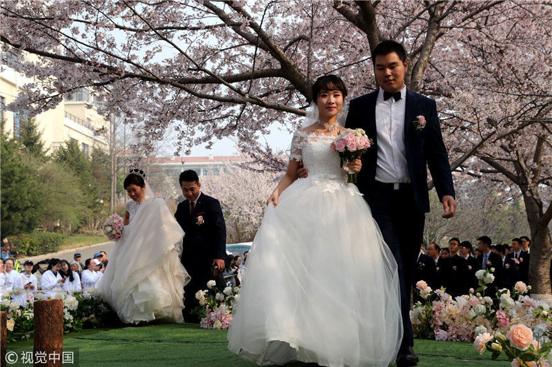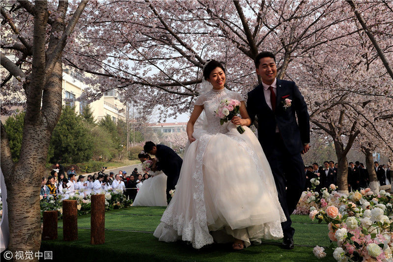 2019年4月6日,山东青岛,中国海洋大学崂山校区举行“情如海大”校友集体浪漫婚礼,由132位校友结成的66对新人一一走过樱花大道,在樱花树下共结连理,并一一接受学弟学妹们的祝福。徐崇德/视觉中国 编辑/陈进