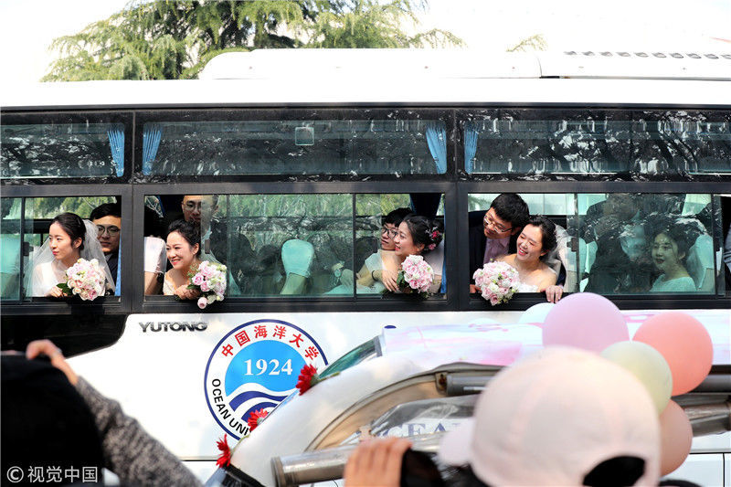 2019年4月6日,山东青岛,中国海洋大学崂山校区举行“情如海大”校友集体浪漫婚礼,由132位校友结成的66对新人一一走过樱花大道,在樱花树下共结连理,并一一接受学弟学妹们的祝福。